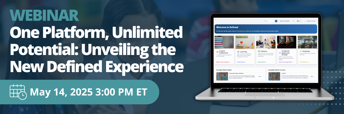 Get a sneak peek of our new unified Defined platform that will be fully rolled out for the 2025-26 school year! This platform represents our commitment to continuously improving how educators connect classroom learning to future success. By bringing our complete ecosystem of solutions together, we're making it easier than ever to implement authentic, deeper learning experiences that develop the career-ready skills every student needs.